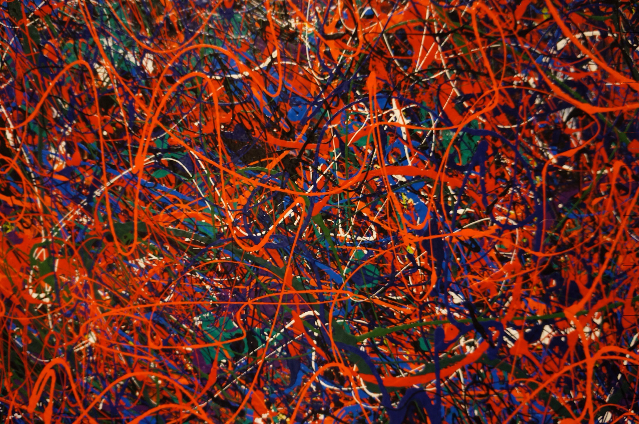 Dad produced thousands upon thousands of signs for Franz, and although this project was made at Franz Sign Company, it was something dad made for himself. During his last seven years there, dad would end each day by dripping the leftover ink from that day’s orders onto this large sheet of plastic. Much like the painter, Jackson Pollock, dad created this picture without the aid of a brush. By orchestrating his loaded squeegee above the plastic sheet, he slowly dripped the ink into various shapes and patterns to help create an overall composition. As he added different hues, he would experiment with how he applied the ink and discovered ways to change the line quality in the work. Sometimes he would apply the ink from far away and sometimes from an extreme close up. This technique was able to give him varying thicknesses in his line. He worked on this project in secret nearly the entire time and didn’t show anyone what he was working on until he felt that it was completed.